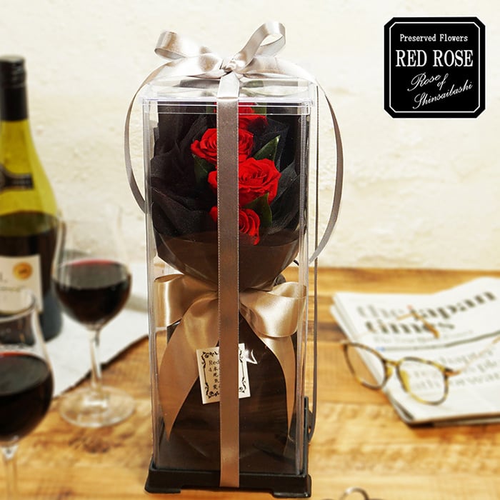 枯れないお花!赤バラ4本のプリザーブドフラワー クリアケース入り 花言葉は「死ぬまで気持ちは変わらない」告白やプロポーズ、結婚4周年のプレゼントに最適
